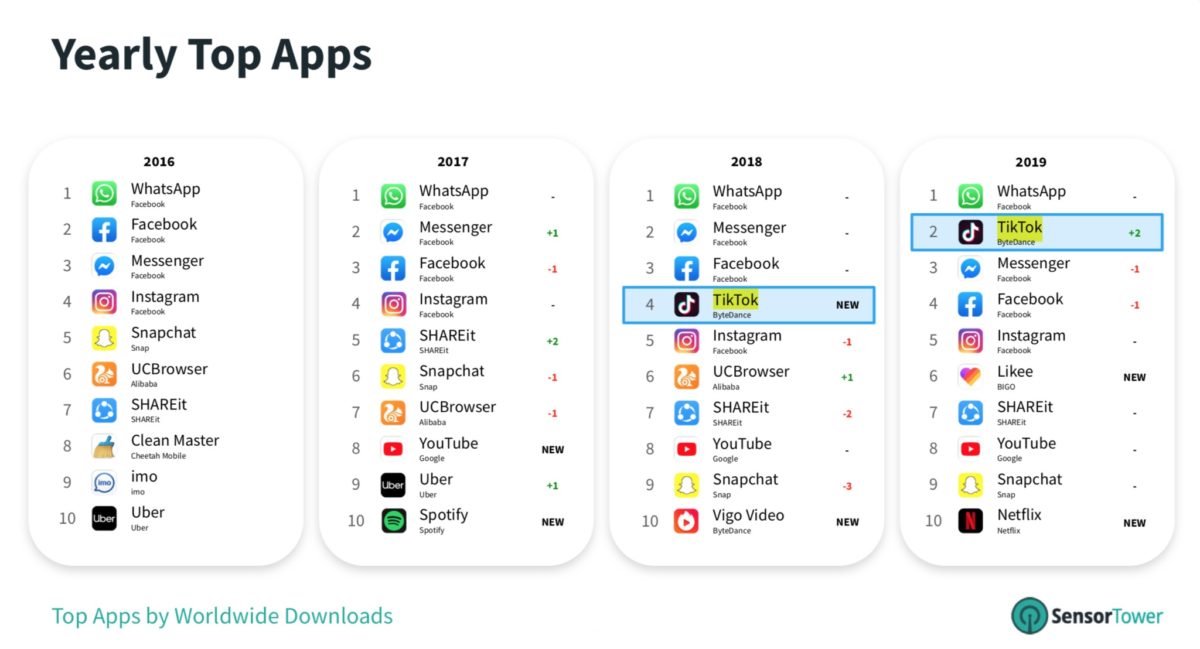 La aplicación TikTok, propiedad de ByteDance, ha alcanzado 1.650 millones de descargas en Apple and Play Store, según un estudio de Sensor Tower. Grabó 738 millones de instalaciones en 2019, lo que convirtió a TikTok en la segunda aplicación más descargada del mundo (excluyendo juegos), justo detrás de WhatsApp y arriba de Messenger de Facebook.